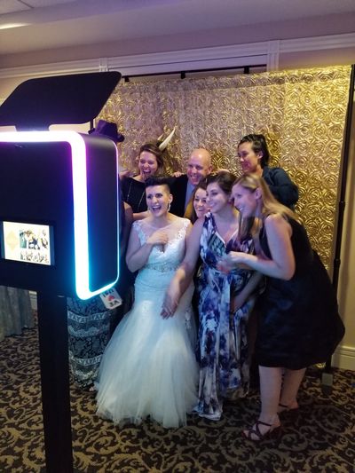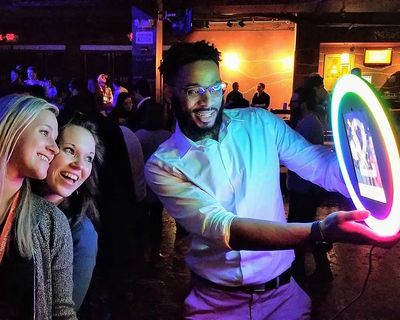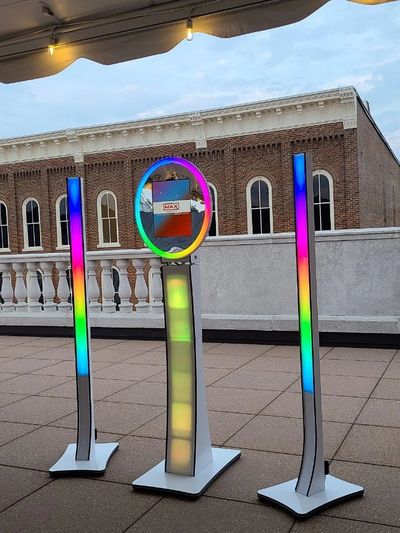 Our new, popular, and exciting Ring Roamer designed to take out during cocktail hour or on the dance floor and send images while your guests party. Truly built for the dance floor! Feel Free to Roam!! Our team brings the photo booth to the people! Our Ring Roamer offers a brand new way to capture and share your memories at your event. The one of a kind Roamer takes photos and GIFs with a studio grade LED light ring that creates sharp, crisp instantly shareable photo. You'll get more candids and more pics from your event!